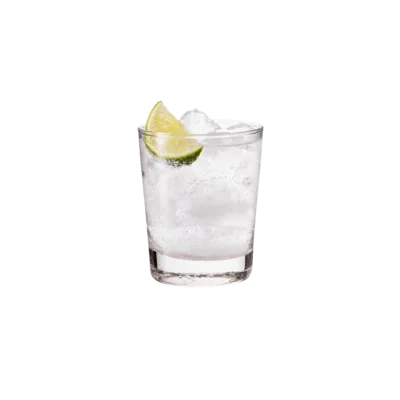 Double strain (tweemaal zeven) de cocktail in een longdrink over ijsblokjes