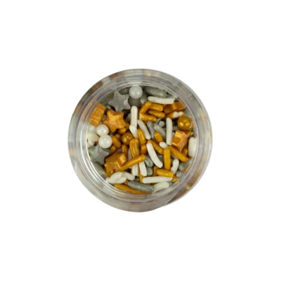 Steek stokjes in de appels en haal ze door de karamel. Garneer nadien met gouden sprinkles en plaats de appels op een bord met bakpapier.