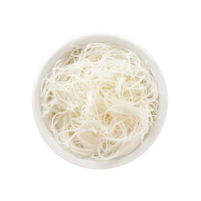 Breng water aan de kook, zet het van het vuur en doe de rijstnoedels in het kokend water. Giet de noedels af na 3 min en laat ze uitlekken. Besprenkel de noedels met een beetje olijfolie zodat ze niet gaan plakken.