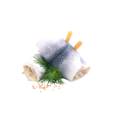 Leg er enkele stukken rolmops op en lepel er enkele lepeltjes yoghurtdressing over. Werk af met enkele plukjes verse dille en een beetje peper.